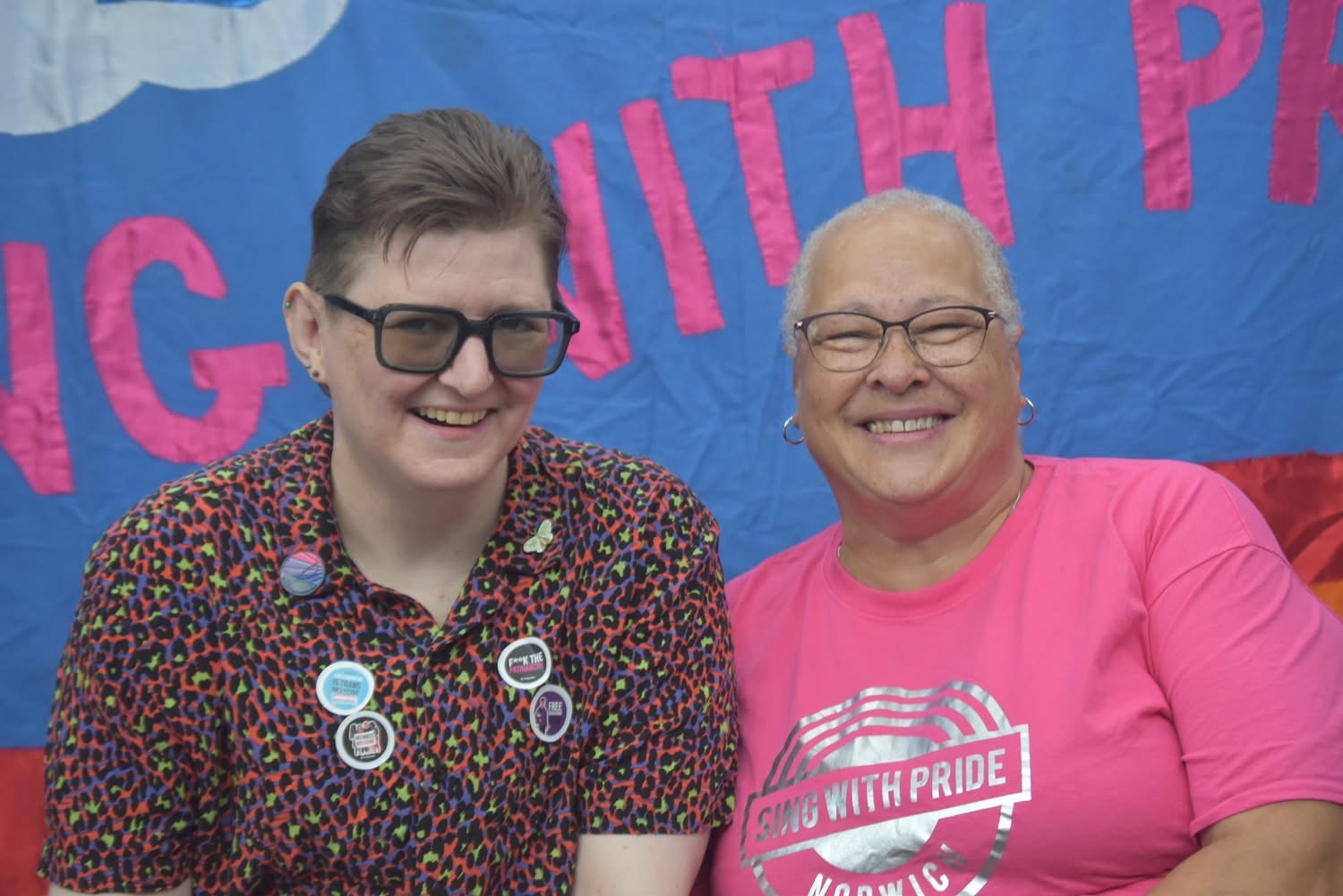We had a wonderful day at Norwich Pride. We had loads of people come to our stall and sign up for more information and our set in the Harvey Milk Lounge went down brilliantly, especially the madrigal version of the Spice Girls ‘Wannabe’ and Grace Petrie’s ‘Black Tie’. We asked people on our stall to write a postcard to their Year 11 self – we had some very sweet, moving and funny responses. Here’s a fabulous photo by Ann Nicolls of of Stevie (secretary) and Eugene (co-chair) on our stall in the Forum.